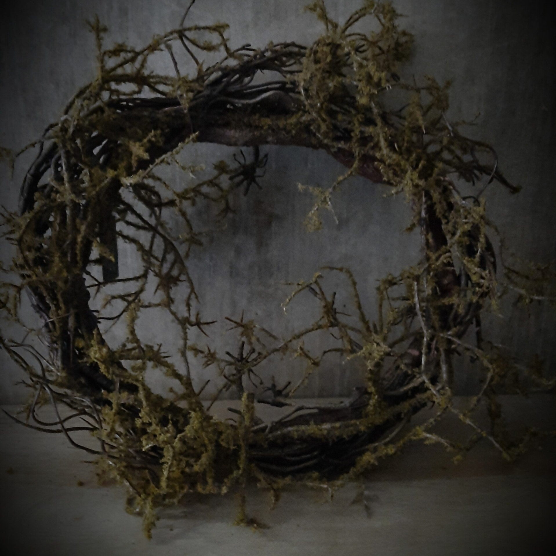 Krans van takken met mos erop. Super leuk met bv een grote kip er op