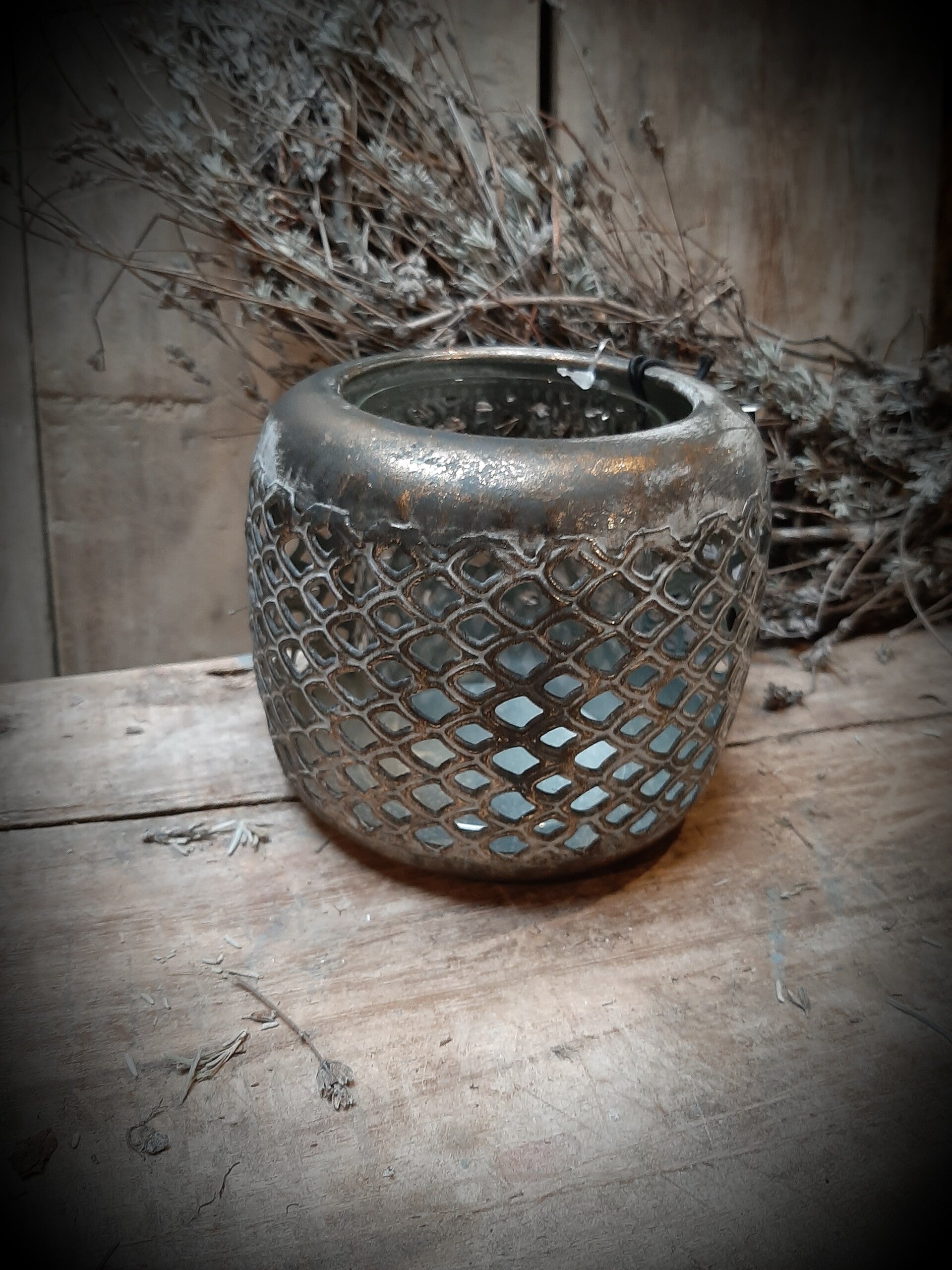 Windlicht antique gold S met glazen binnenlichtje
